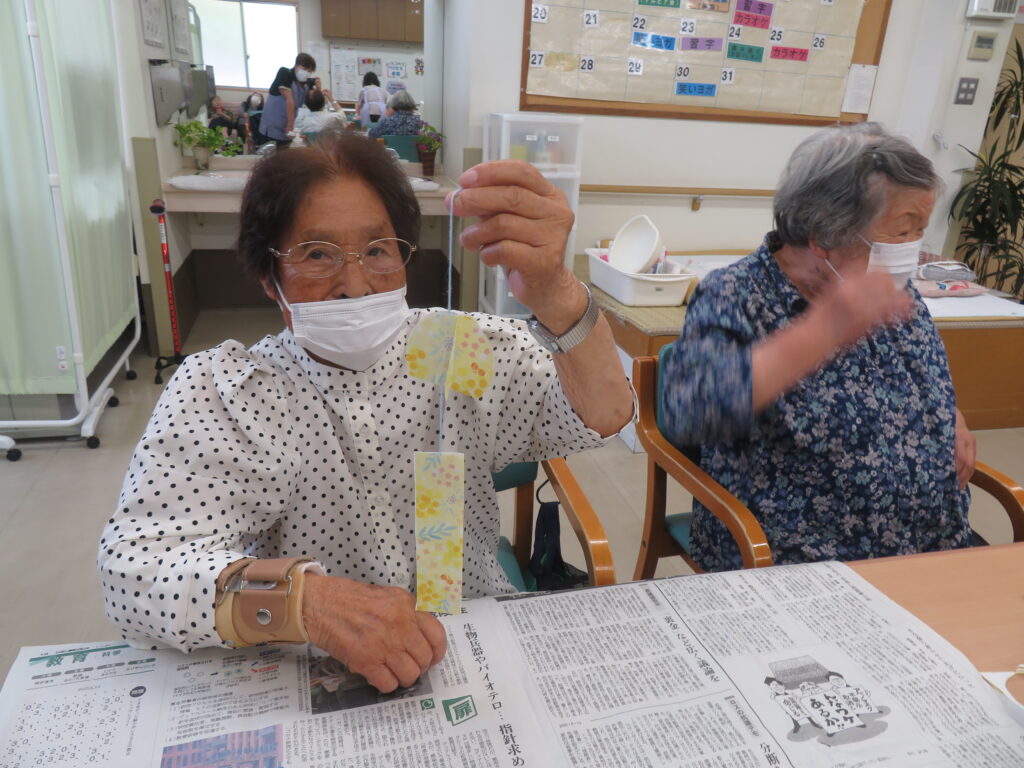 折り紙を切って、間に糸をはさんで貼り合わせて、風鈴を作りました🎐