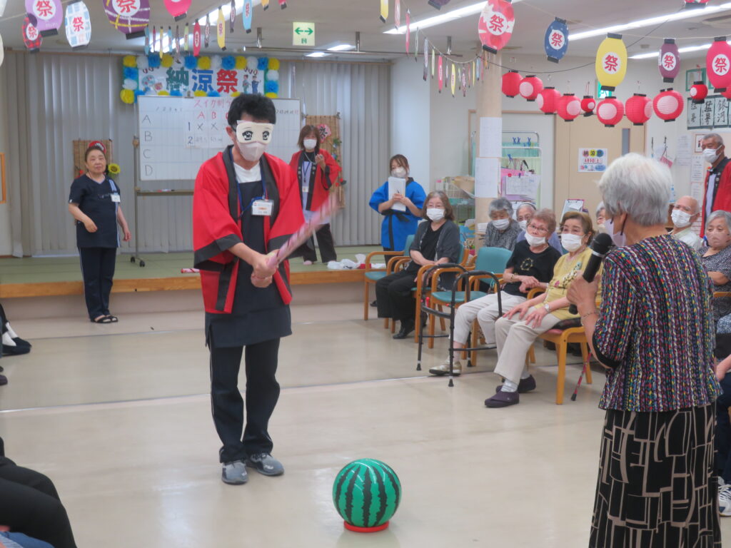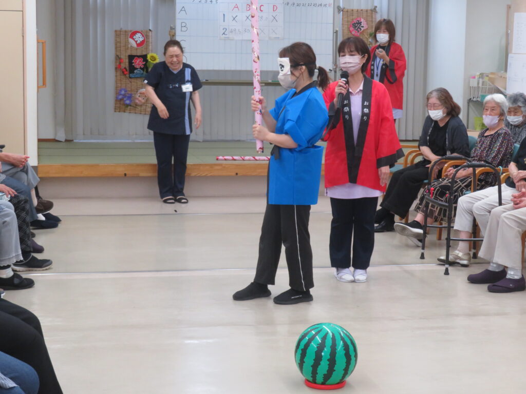 利用者さんに「もうちょっと左やねぇ」「こっちじゃないよぉ〜」と誘導いただき、スタッフがスイカを割ります。